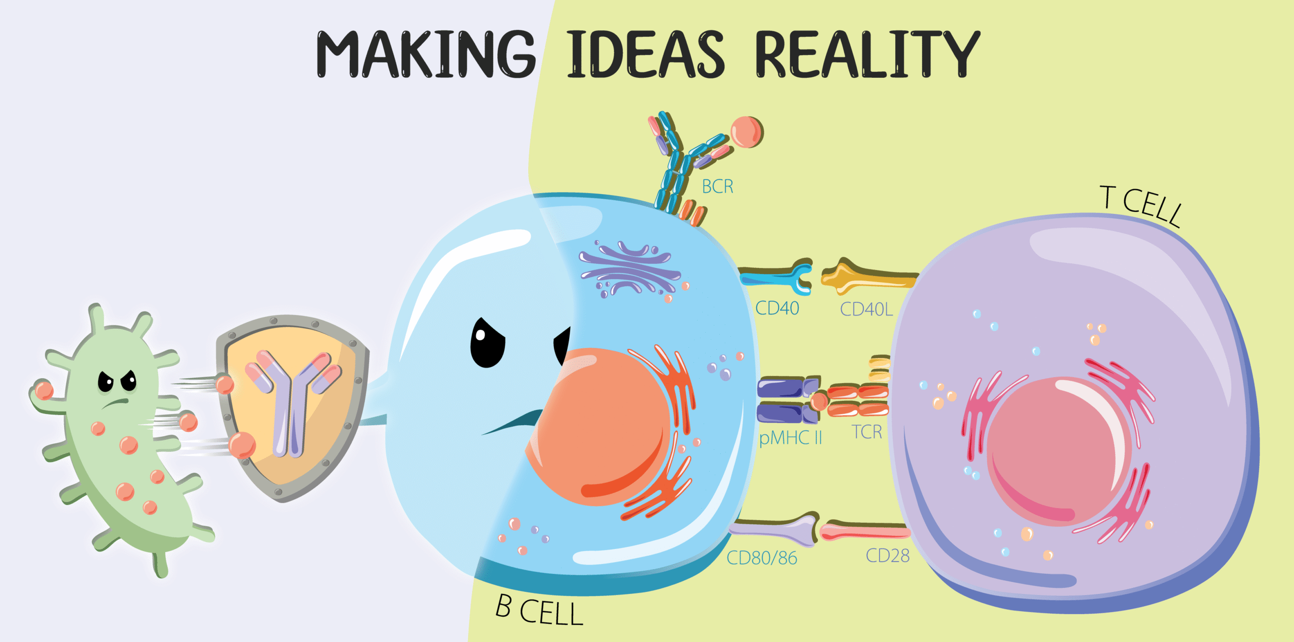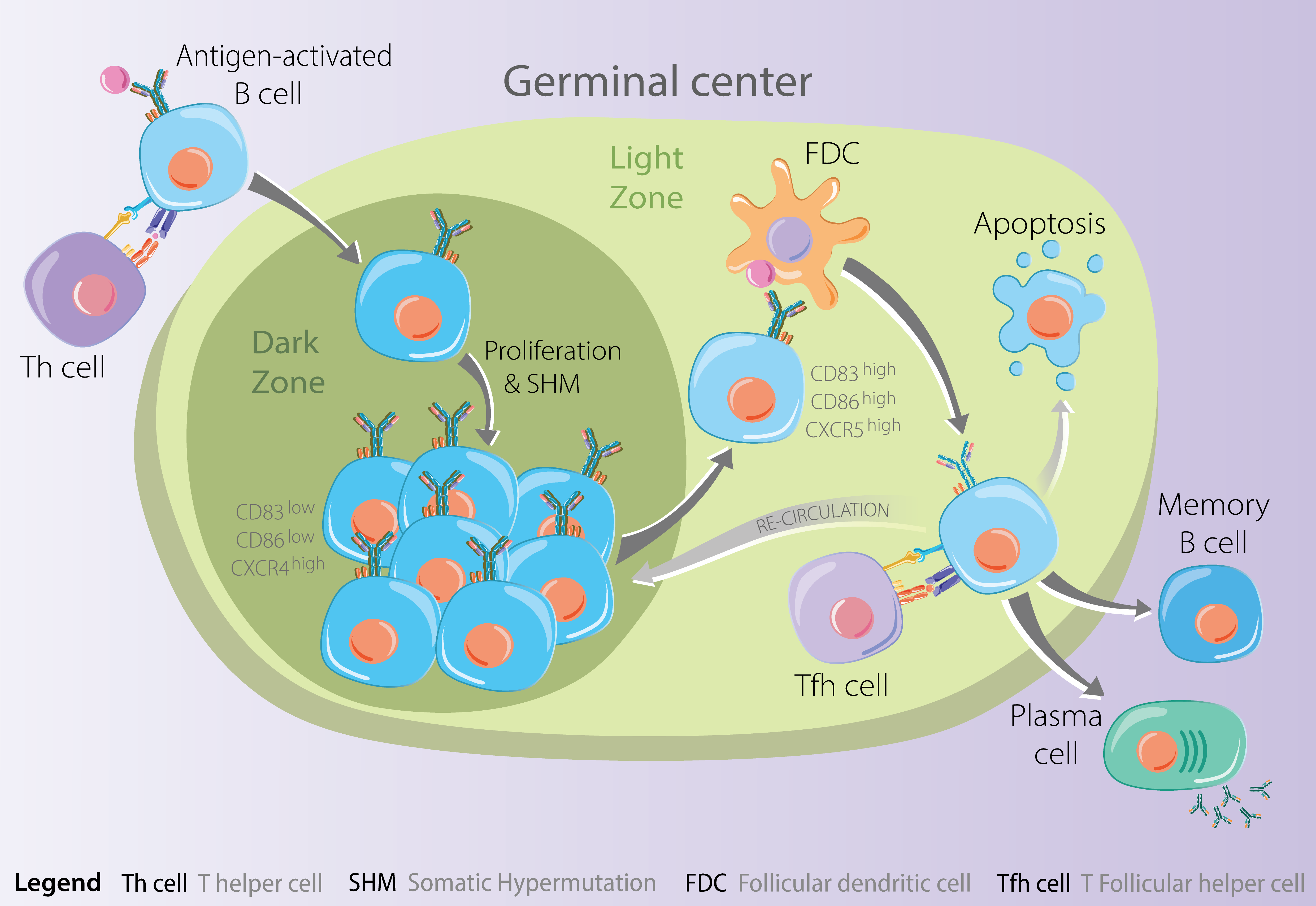 This image shows the germinal centre. It is divided into the dark zone (left) and the light zone (right). In the dark zone, B cells undergo proliferation and somatic hypermutation (SHM) to diversify their B cell receptors (BCRs). These B cells then migrate to the light zone, where they interact with antigen-presenting follicular dendritic cells (FDCs) and T cells. High-affinity B cells receive survival signals through CD40 and peptide-MHC interactions, leading to positive selection. Cells with lower affinity or unfavourable mutations undergo apoptosis. Positively selected B cells differentiate into either memory B cell precursors or plasmablasts, contributing to long-term immunity and antibody production.